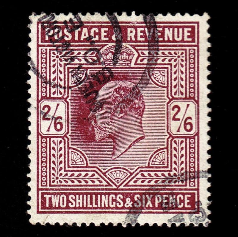 Sound used example of Scott #139, the 2 shilling 6 pence definitive of 1902 with two partial strikes of a fiscal cancellation. Good colour and centering.