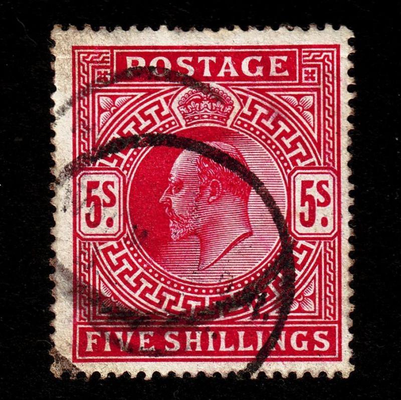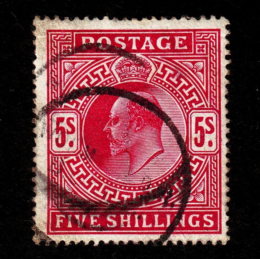 Sound used example of Scott #140, the 5 shilling carmine rose definitive of 1902, with double strike of unidentified fiscal cancellation. Good colour and centering.
