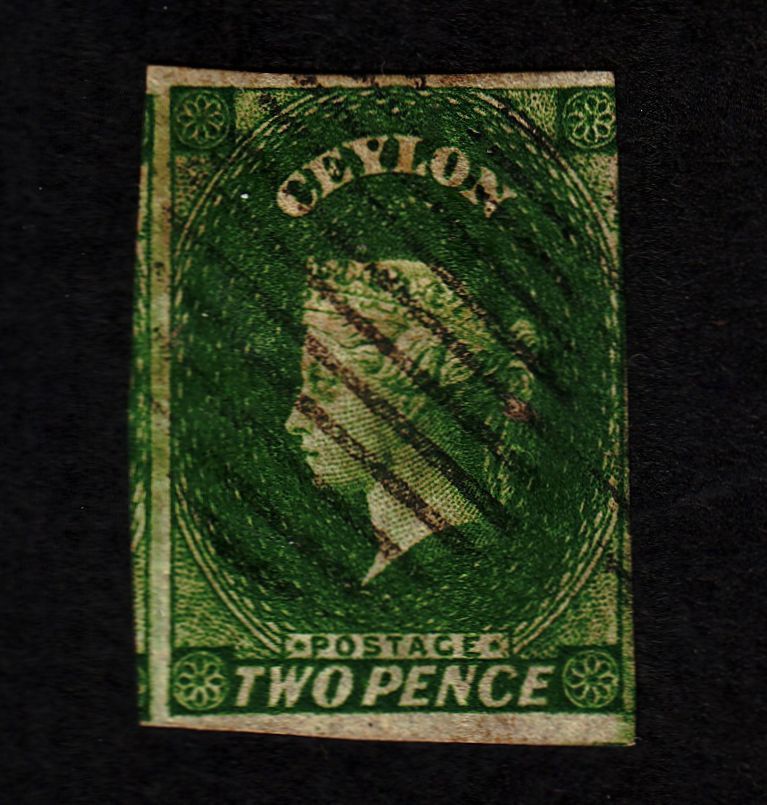 Close-cut used example of Scott #4, the 2 pence deep green definitive stamp of 1857, with parallel bars cancellation. Clear margins on three sides.Seller Information