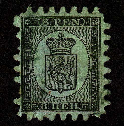 Used example of Scott #7, the 8 pennia black on green rouletted stamp of 1867, with several short teeth. Indistinct cancellation. Attractive example of a scarce stamp.Seller Information