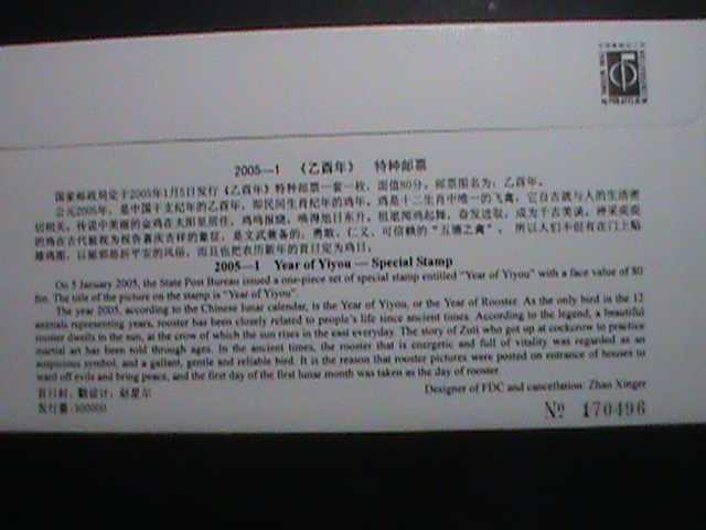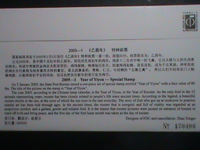 China stamp-fdc-2005-sc#3418 year of the rooster new year greeting mnh--fdc-Very fine and hard to find. Mint not hing- very special new year of animals series