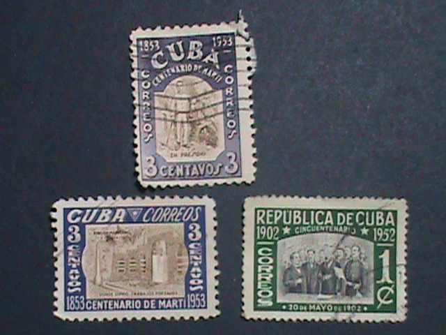 CUBA-1952 BIRTH PLACE OF JOSE MARTI THREE VERY OLD CUBA USED STAMP-VERY FINE