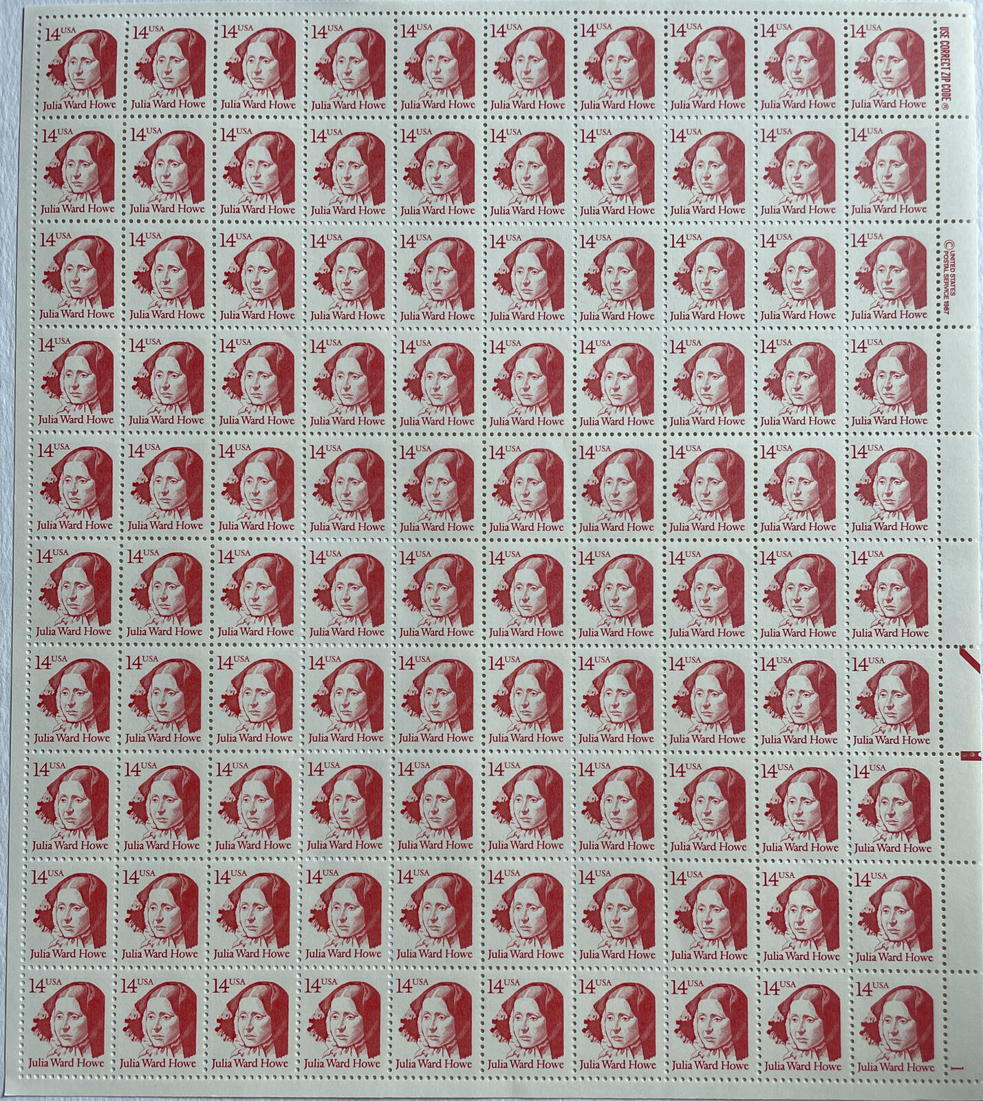 Scott #2176 JULIA WARD HOWE Sheet of 100 US 14¢ Stamps MNH 1987