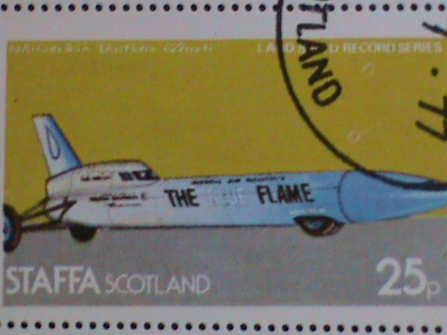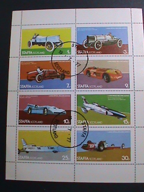 Staffa-scotland-1977 fomula race cars- cto sheet-vf-with first day of postal cancel cto sheet very fine