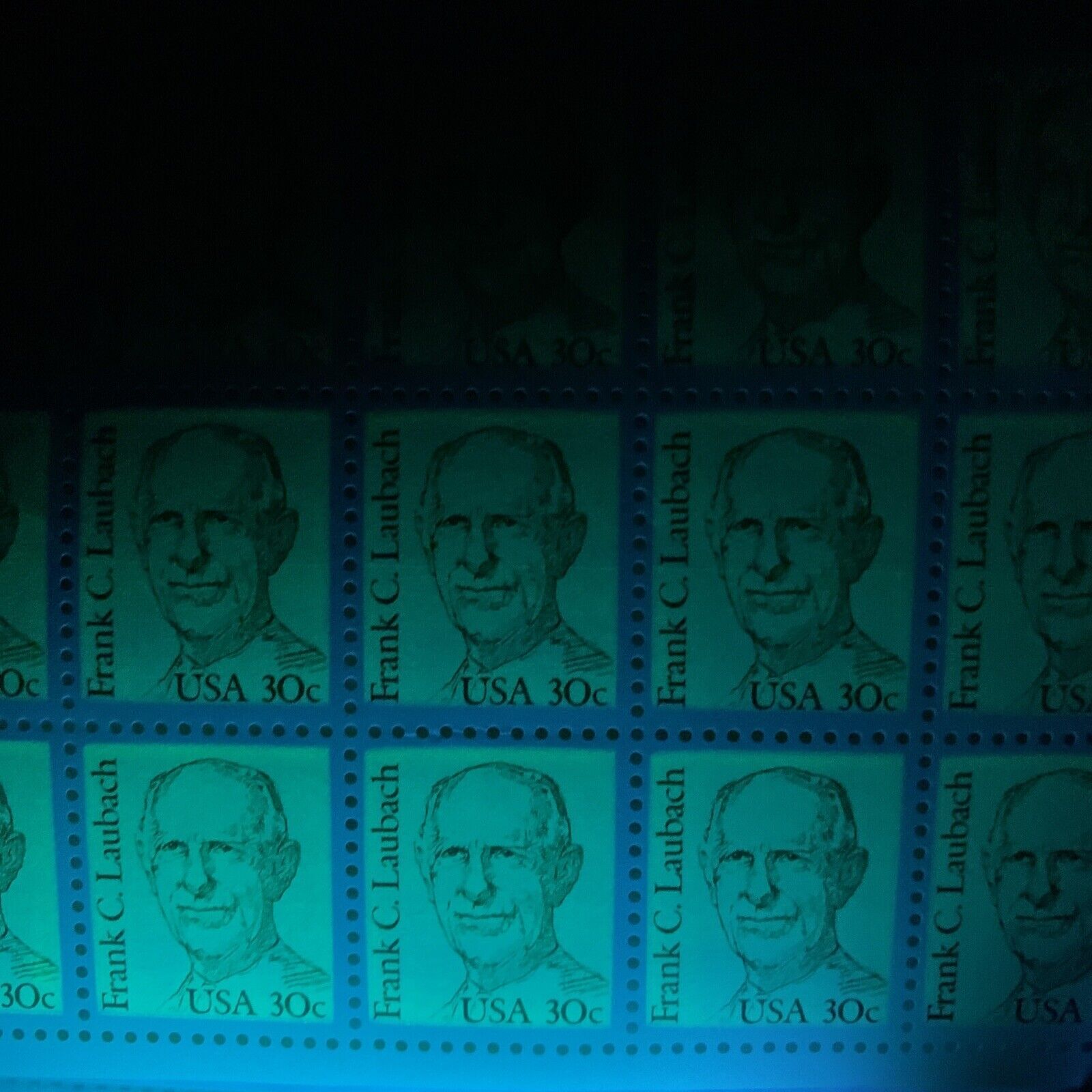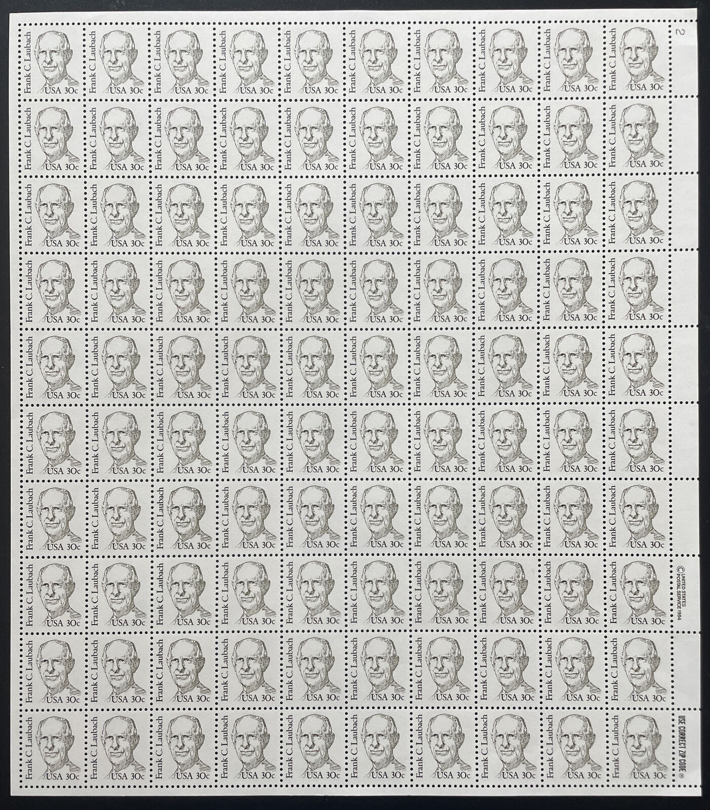 1864A FRANK C. LAUBACH Large Block Tagged Sheet of 100 US 30¢ Stamps MNH 1984