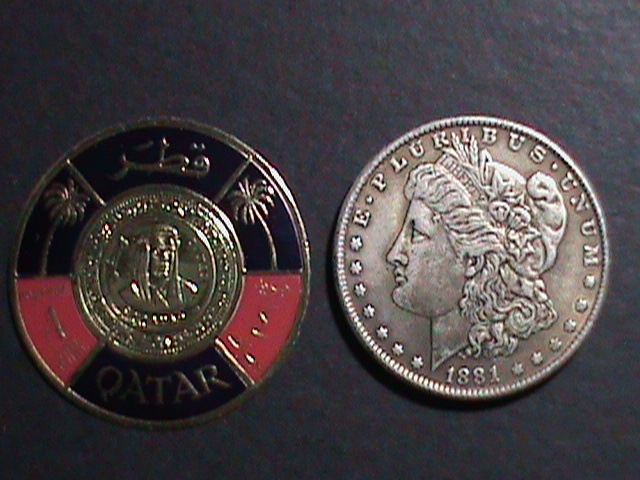 Qatar-1966 sc# 99b sheik ahmad coin-gold foil stamp-mint very fineThe silver coin is for compare the size of the stamp, not included in the lot.
