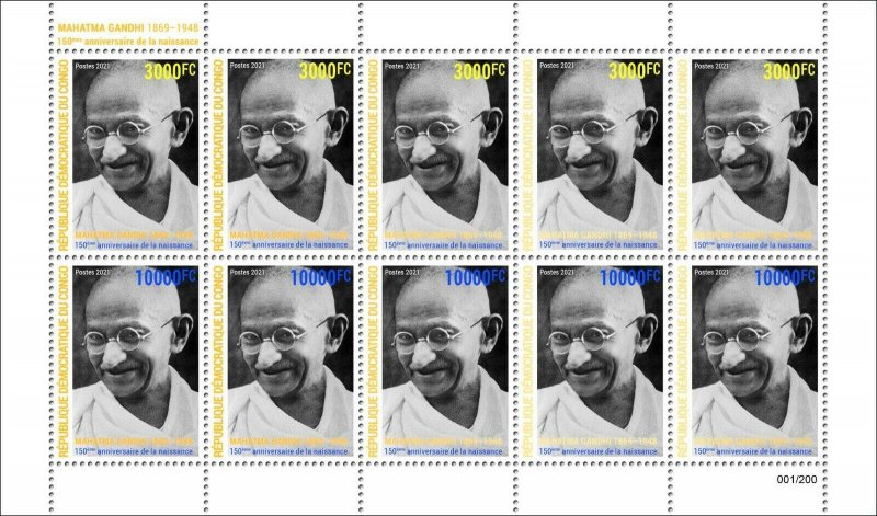 DR CONGO 2021 ¤ GOLD ¤ SHEETLET GRAY - ISSUE JOINT - MAHATMA GANDHI - RARE MNH-