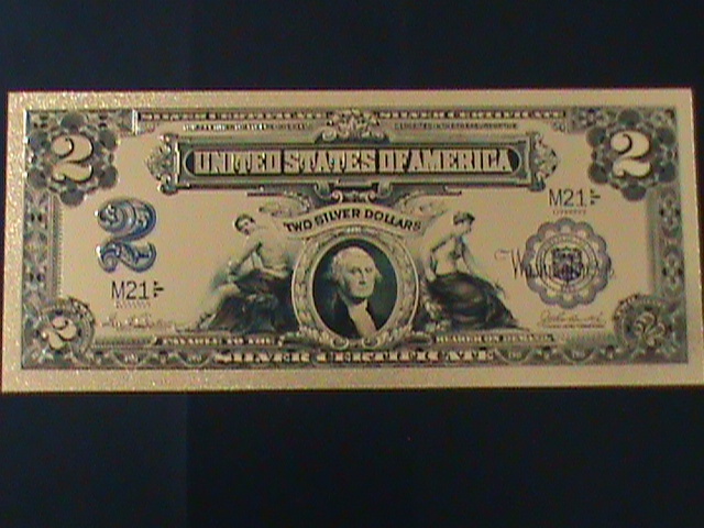 United states-1899 cat.#339- 24 karat gold replica $2 -vf with certificate-126-years old-est. $4524 karat gold replica bank note in certificate of authenticity sleeve-with a golden ceritficate card