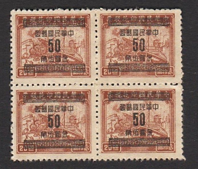 China 1949 Large Surcharge on Rev with "Short hook 貳"字短勾(Chan# G82f, B/4) MNH