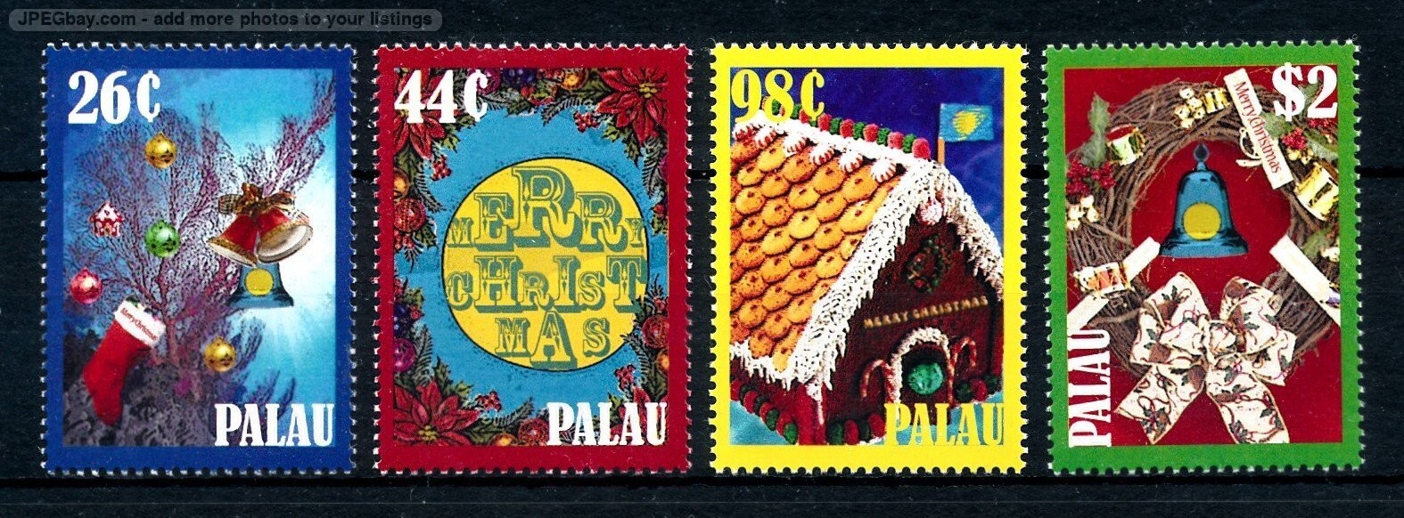 Grade: Ungraded[121052] Palau 2009 Christmas No�l Navidad MNH Mint Never Hinged Very Fine ConditionCatalogue numbers according to Michel if noted2910-2913Standard Shipping and International Standard Delivery is without tracking number. Economy Shipping and Hip International Standard delivery is a registered letter with tracking code. A signature is required. STANDARD SHIPPING AND INTERNATIONAL STANDARD DELIVERY IS AT BUYERS RISK Shipping to China, Russia and former Sovjet States, Romania, Bulgaria, Albania, India, Turkey, Indonesia, Malaysia, all African countries by Registered Mail only! World wide shipping valued at over US$100 will be sent via Registered Mail only. Add Hip International Standard delivery as shipping option! Countries in Latin America valued at over US$ 50 will be sent via Registered mail only! Add Hip International Standard delivery as shipping option! We ship lots paid for at least within 4 days. We are not responsible for uninsured or unregistered mail. By bidding or buying any lots you agree with the above terms of shipping. EUROPOST-STAMPS, THE NETHERLANDS SINCE 1986 IN STAMP, COIN AND BANKNOTE BUSINESS MEMBER OF STAMPDEALERS ASSOCATIONS"width=900">