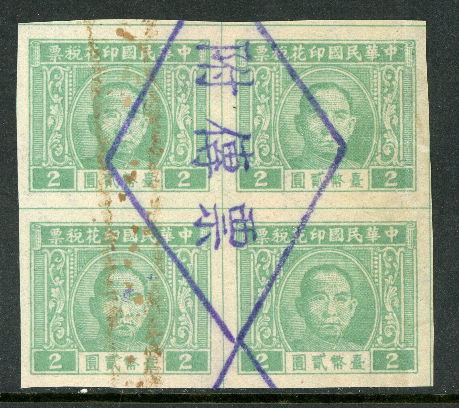 Free China 1946 Taiwan Revenue $2.00 Grey Lilac Imperf Margin Block VFU D440 ️