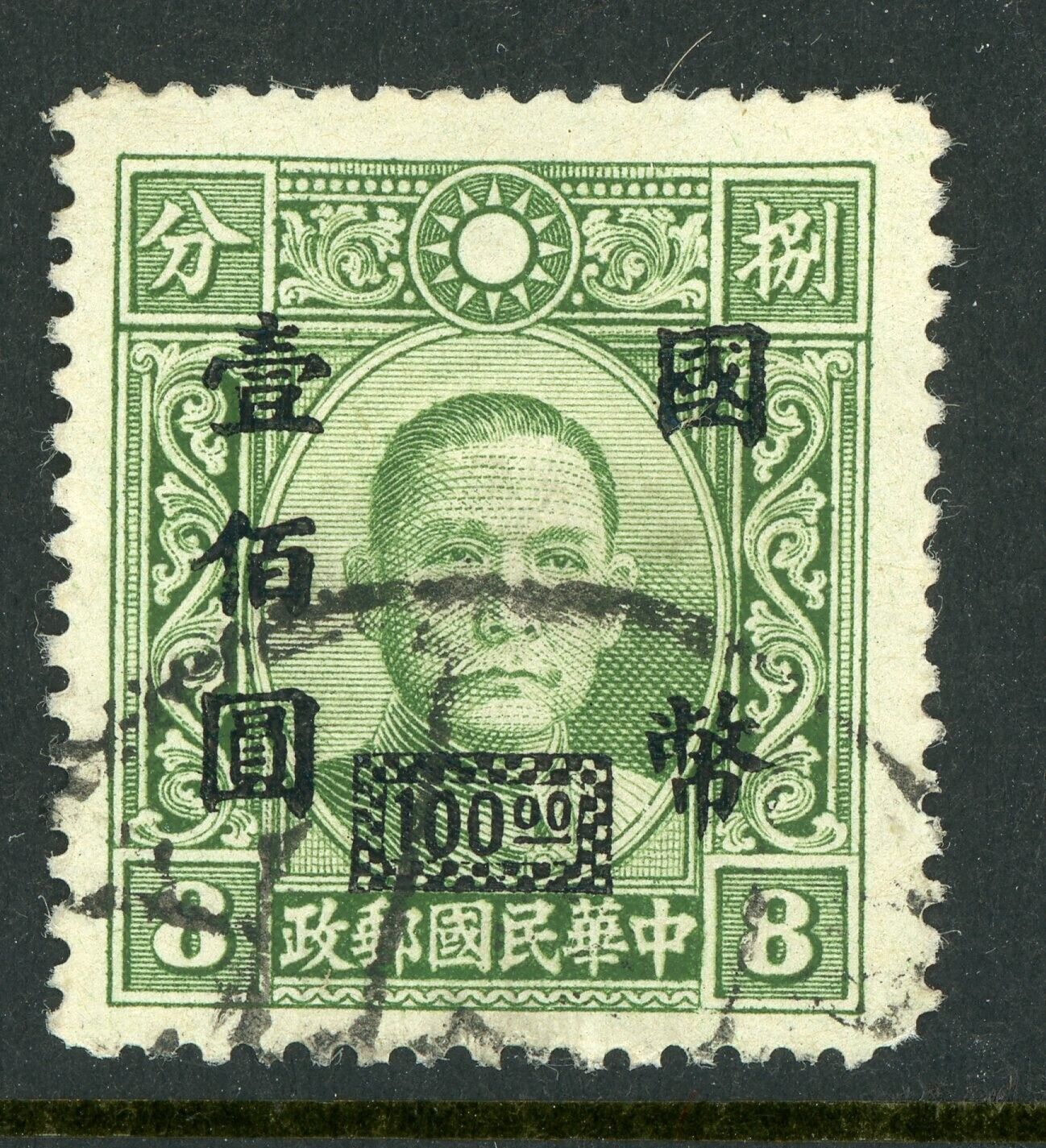 China 1947 Republic $100.00/8¢ Olive Green No DAH Scott 676a VFU S220