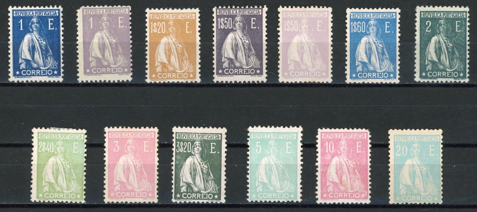 Condition: Mint Original Gum Hinged Grade: VF (Very Fine) The extremely scarce Portugal 1923-26 Complete stamp set Scott# 298I-298U features historical figure Ceres and originates from Portugal and its colonies. ... Read More