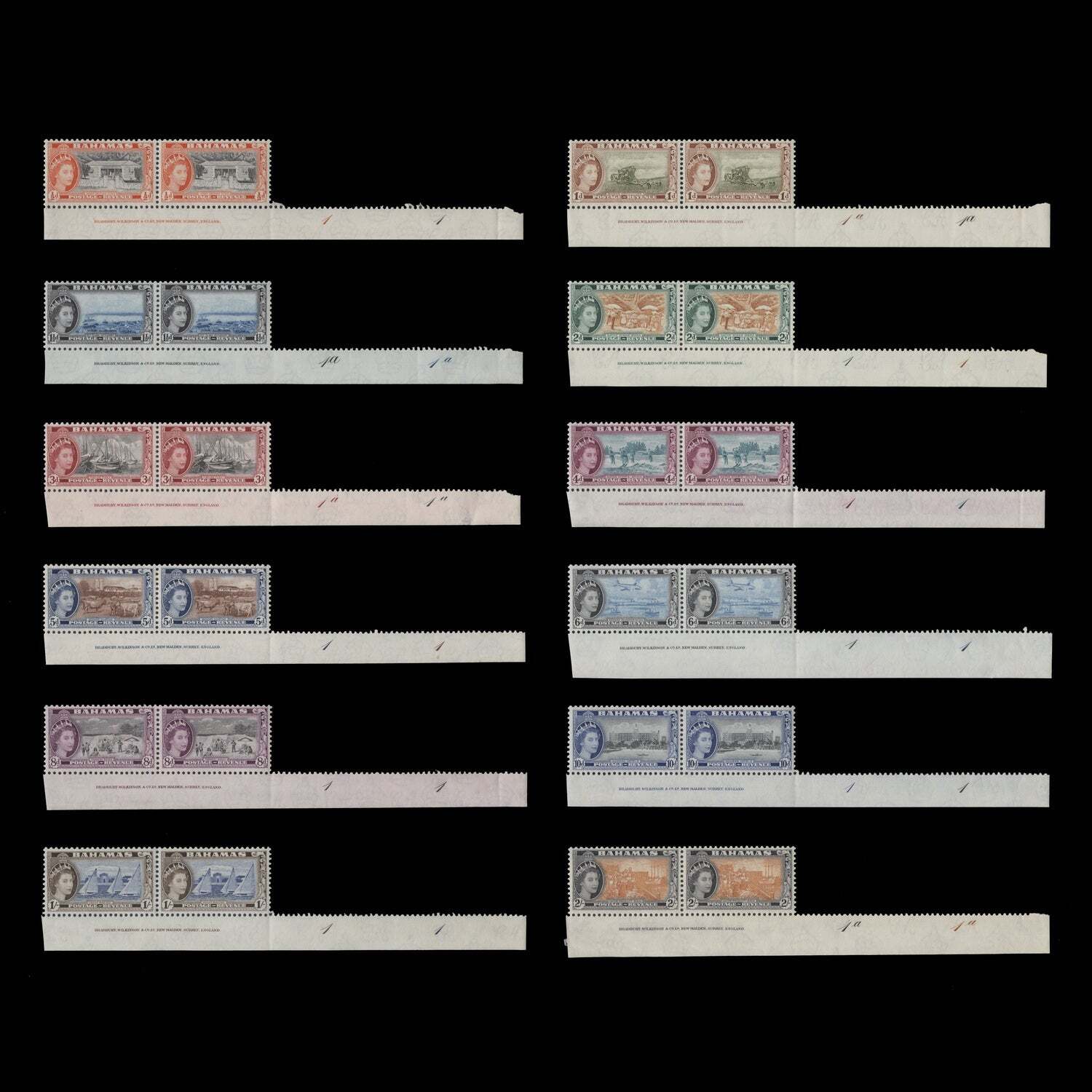 Definitive series to 2s imprint pairs with additional selvedge showing plate numbers (12 items). Fresh and fine. Mounted in the margins only. Stamps mint never hinged. SG201-212; SC158-169Offers History