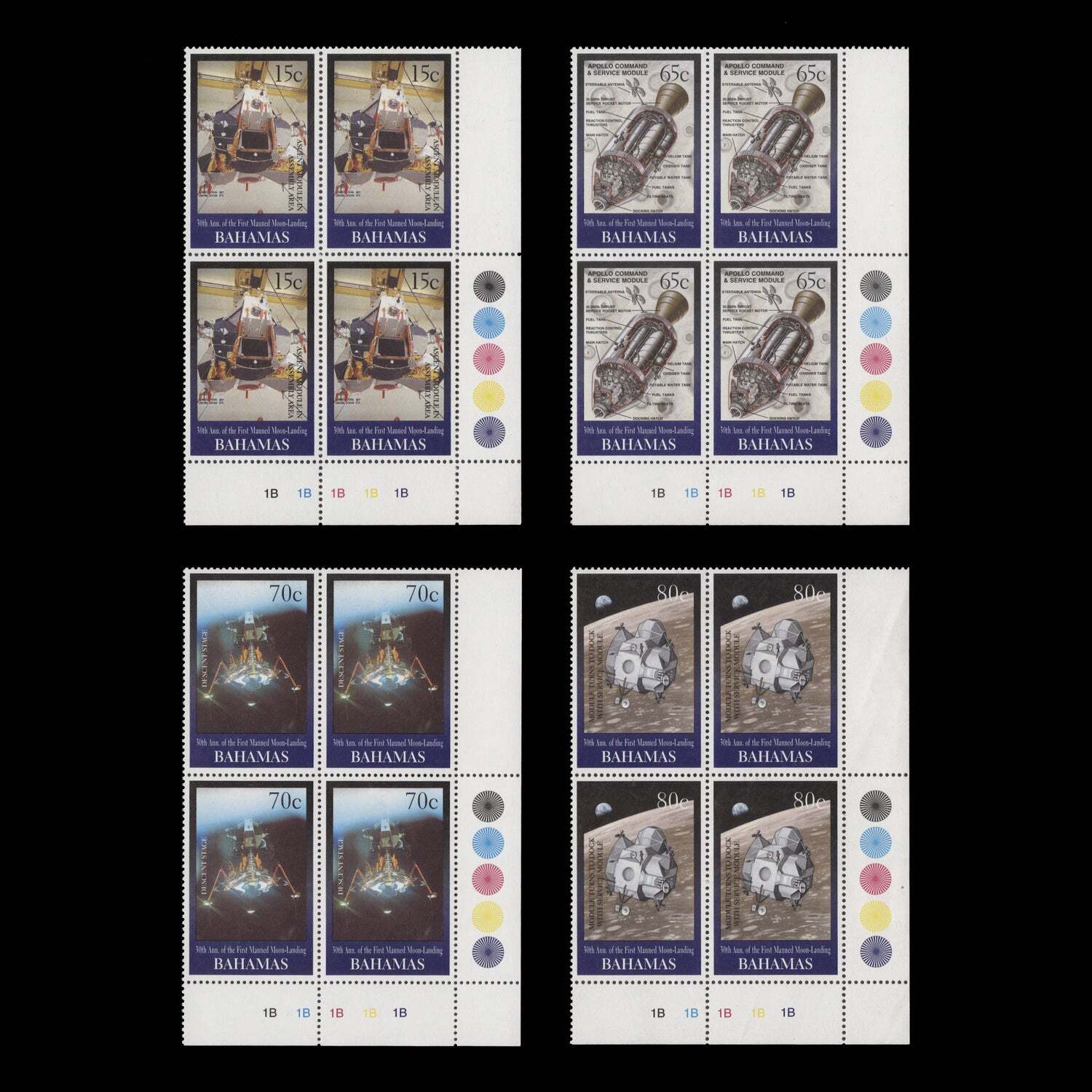 First Manned Moon Landing Anniversary traffic light/plate 1B–1B–1B–1B–1B blocks x 4 (4 items). Fresh and fine. Mint never hinged. SG1179-1182; SC942-945Offers History