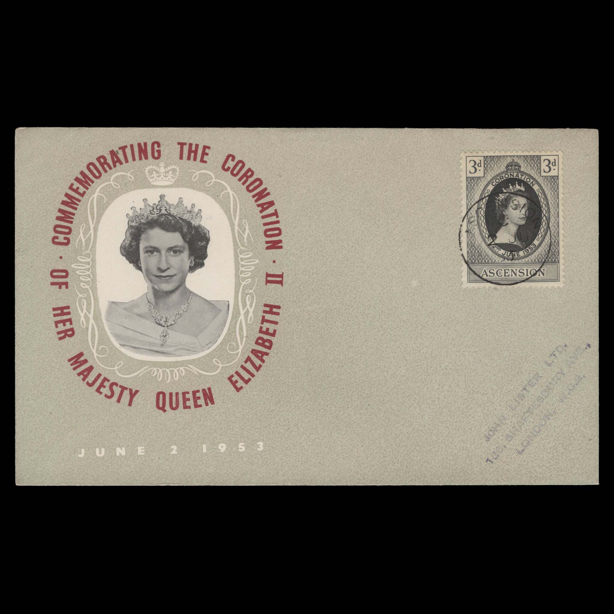 3d Coronation single on type 2a John Lister self-addressed cover with ASCENSION circular cancel dated 2 JU 53, the first day of issue. Generally fine. SG56; SC61Offers History