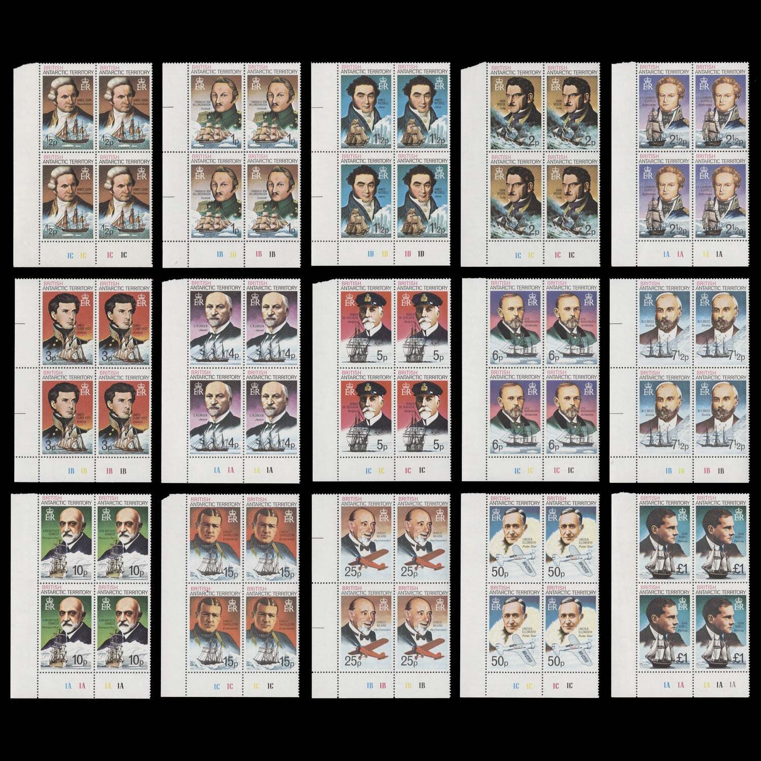 Antarctic Explorers definitives, perf 14 x 14½, multiple St Edward's crown and block CA sideways watermark, plate blocks x 4 (15 items): ½p, 2p, 5p, 6p, 15p, 50p (1C–1C–1C–1C); 1p, 3p, 7½p, 25p (1B–1B–1B–1B); 1½p (1D–1D–1D–1D); 2½p, 4p, 10p (1A–1A–1A–1A); £1 (1A–1A–1A–1A–1A). Difficult assembly. Fresh and fine. Mint never hinged. SG44-58; SC45a-59a; SH45-59Offers History