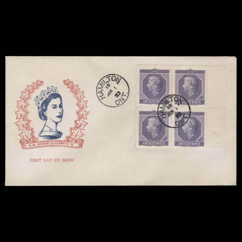 Canada 1953 (FDC) 4c Coronation block, HAMILTON ️