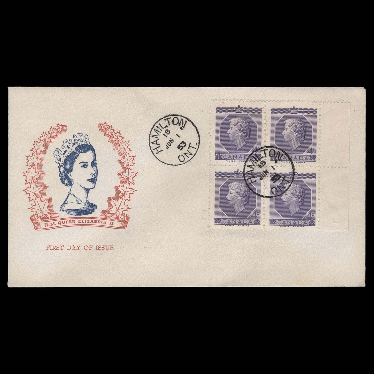4c Coronation block x 4 on type 1b Herman Jacobi unaddressed cover with HAMILTON, ONT circular cancels dated JUN 1 53, the first day of issue. Generally fine. SG461; SC330Offers History
