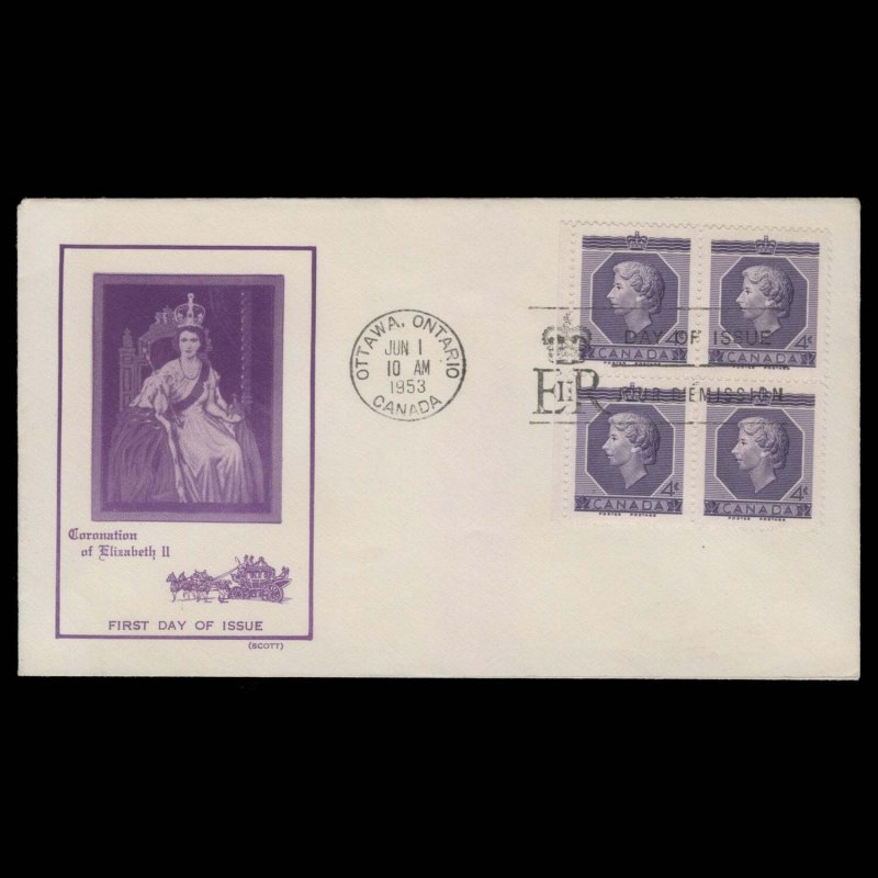 4c Coronation block on type 1 B Scott unaddressed cover with special slogan and OTTAWA, ONTARIO circular cancel dated JUN 1 1953, the first day of issue. Fresh and fine. SG461; SC330Offers History