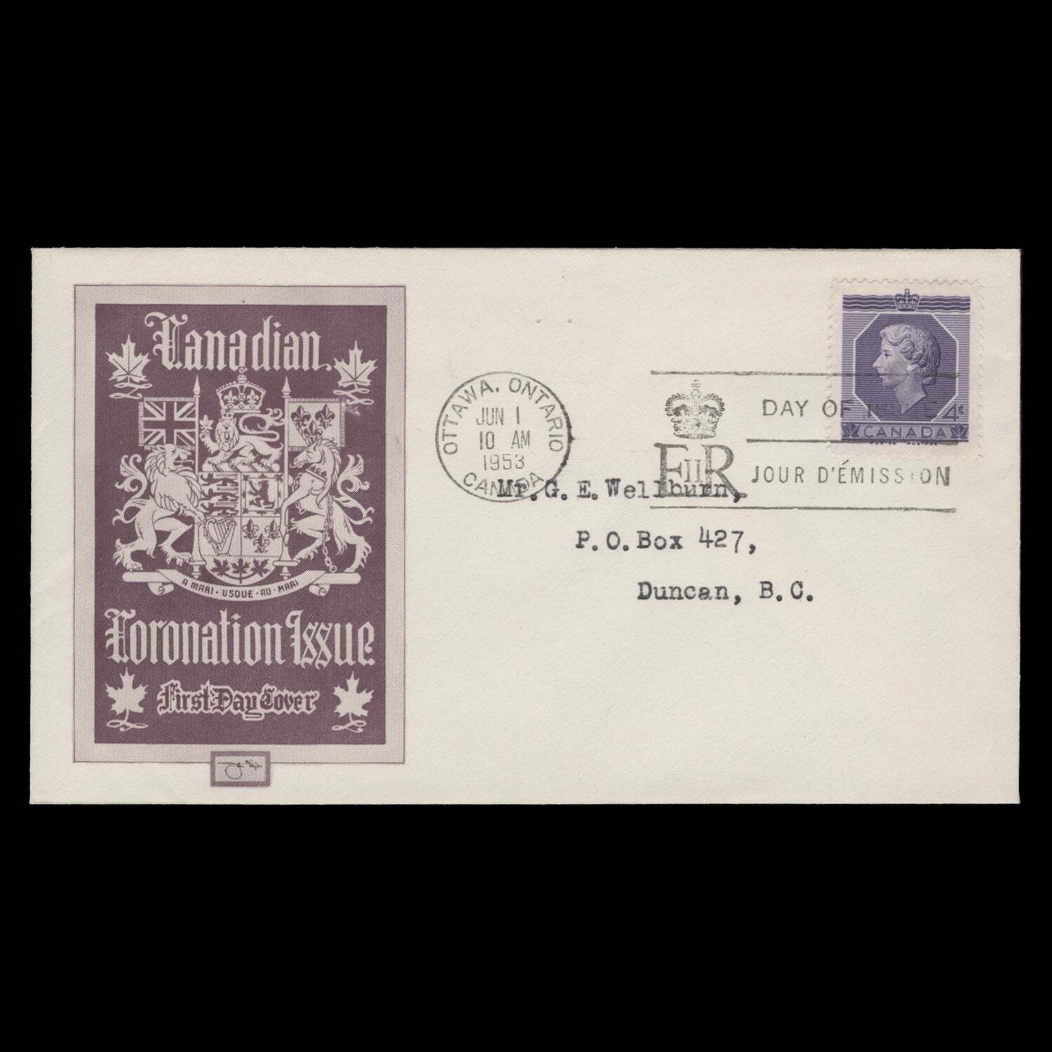 4c Coronation single on type 1b W L Fluck cover with special slogan and OTTAWA, ONTARIO circular cancel dated JUN 1 1953, the first day of issue. Generally fresh and fine. SG461; SC330Offers History