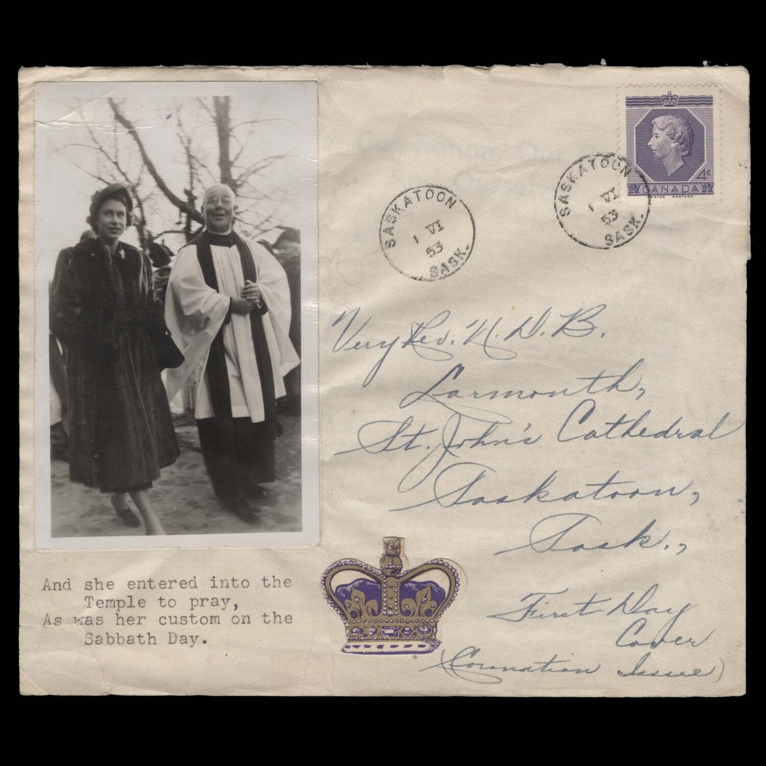 4c Coronation single on self-addressed dean Norman Larmonth (1894–1976) cover, featuring a photograph of himself and Princess Elizabeth at St John's Cathedral in Saskatoon on 28 October 1951, with SASKATOON, SASK circular cancels dated I VI 53, the first day of issue. Delightful tribute. Slit at top and tatty otherwise fine. SG461; SC330- Item Location