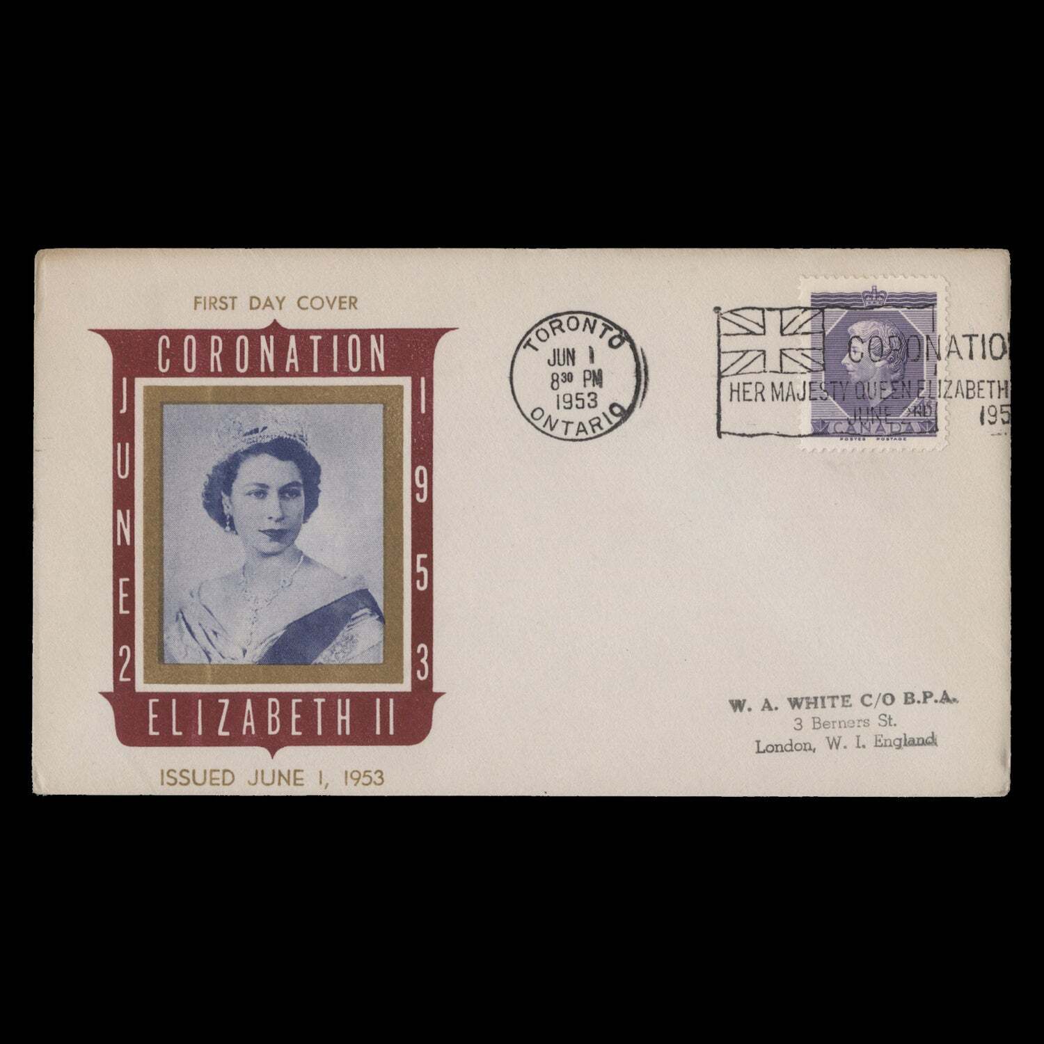 4c Coronation single on type 1b Personal Cover Service cover to England with special slogan and TORONTO, ONTARIO circular cancel dated JUN 1 1953, the first day of issue. Signs of ageing otherwise fine. SG461; SC330Offers History