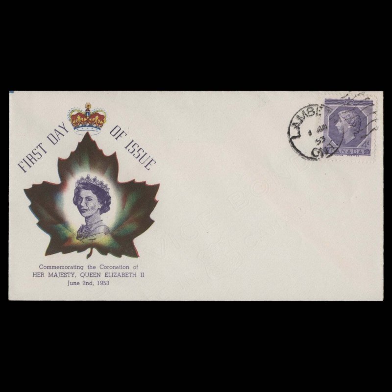 4c Coronation single on type 1b Philatelic Supply Company unaddressed cover with LAMBETH, ONT circular cancel dated 1 JUN 53, the first day of issue. Generally fine. SG461; SC330