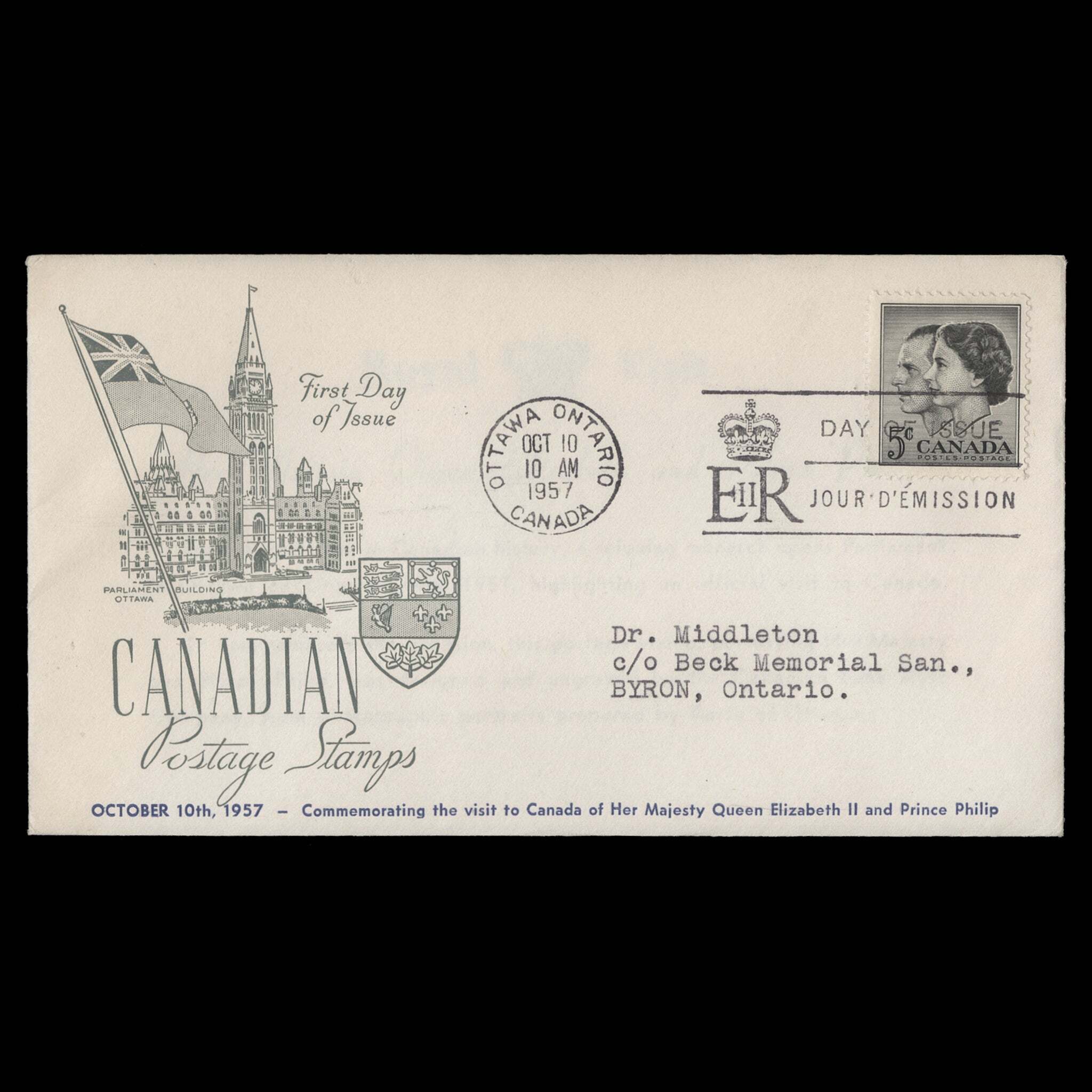 5c Royal Visit single on Middlesex Stamp Circle cover with slogan and OTTAWA, ONTARIO, CANADA circular cancel dated OCT 10 1957, the first day of issue. Generally fresh and fine. SG500; SC374- Item Location