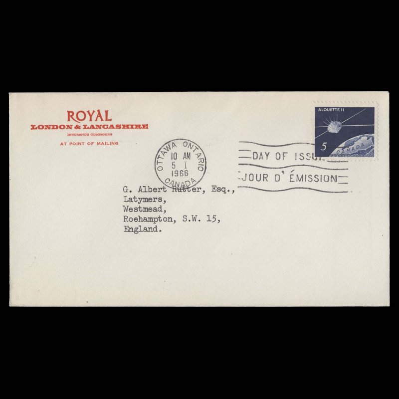 5c Alouette II single on Royal/London & Lancashire cover to England with slogan and OTTAWA, ONTARIO, CANADA circular cancel dated 5 I 1966, the first day of issue. Generally fine. SG570; SC445Offers History