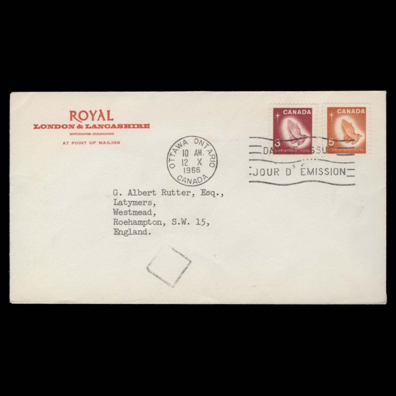 Christmas set on Royal/London & Lancashire cover to England with slogan and OTTAWA, ONTARIO, CANADA circular cancel dated 12 X 1966, the first day of issue. Scarce. Generally fine. SG576-577; SC451-452Offers History