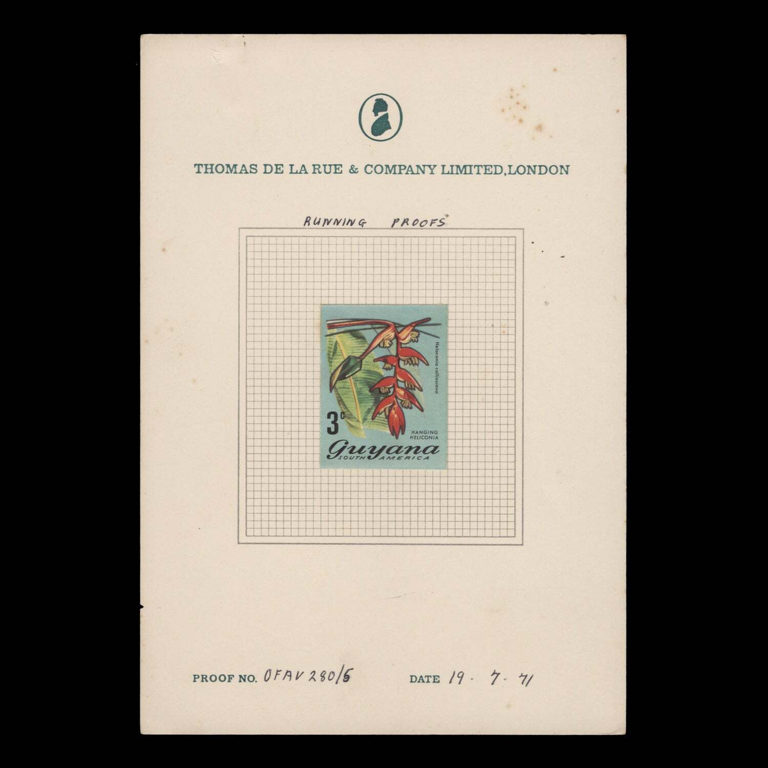 3c Hanging Heliconia impeforate running proof on numbered and dated De La Rue presentation card. Scarce. Card with signs of ageing otherwise generally fine. SG544var; SC135varOffers History