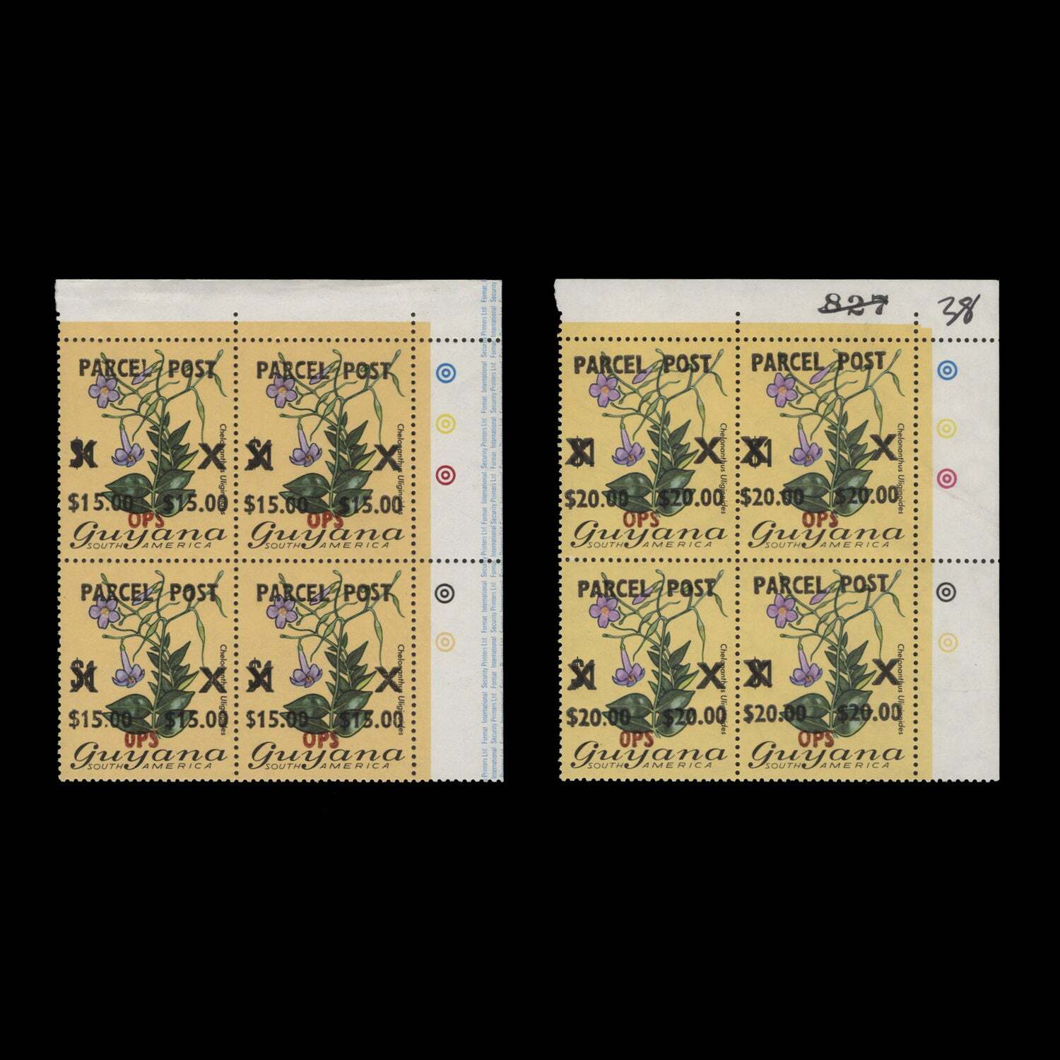 $1 Chelonanthus Uliginoides 'PARCEL POST' traffic light blocks x 4 with additional 'OPS' overprint in red for official use (2 items). Fresh and fine. Mint never hinged. SGOP1/OP2; SCQO1/QO2Offers History