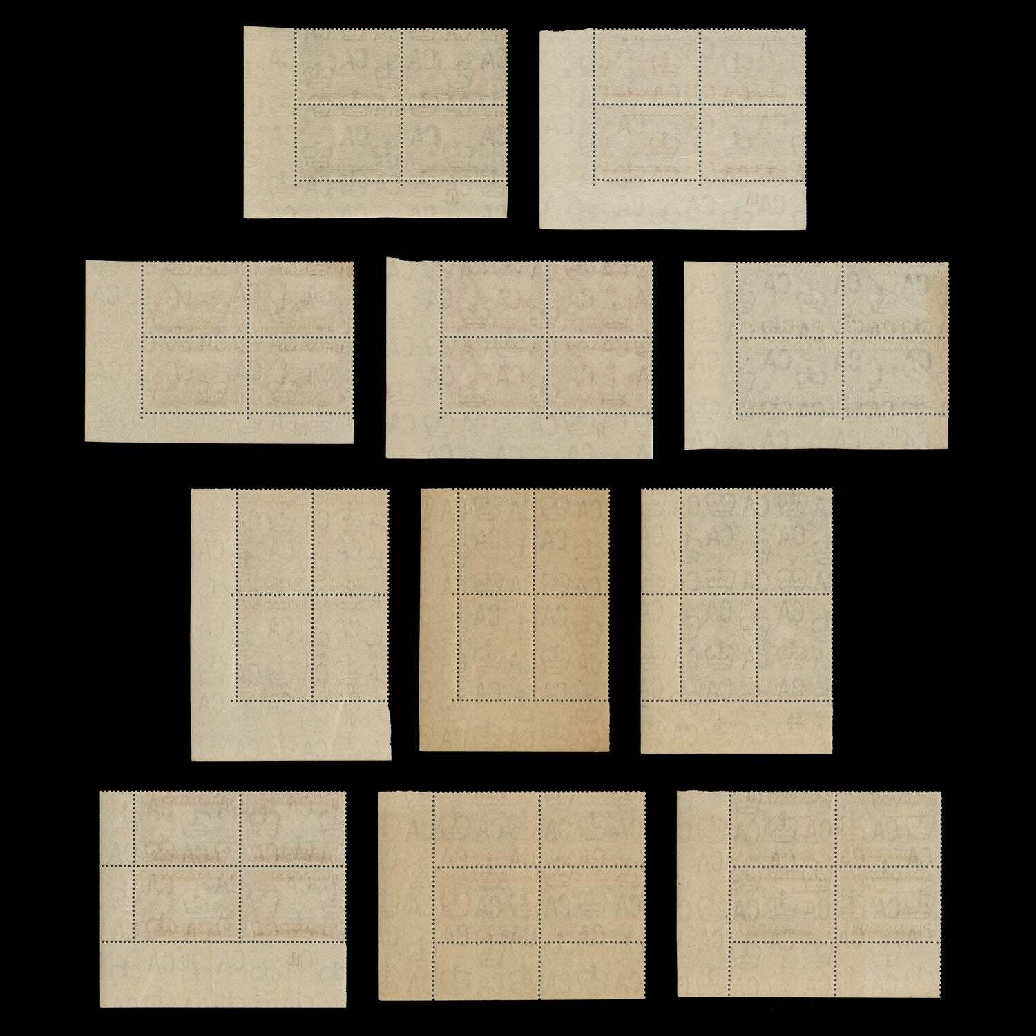 Definitive series plate blocks x 4 (11 items). Light to moderate gum toning otherwise fine. Mint never hinged. SG39-49; SC45-55