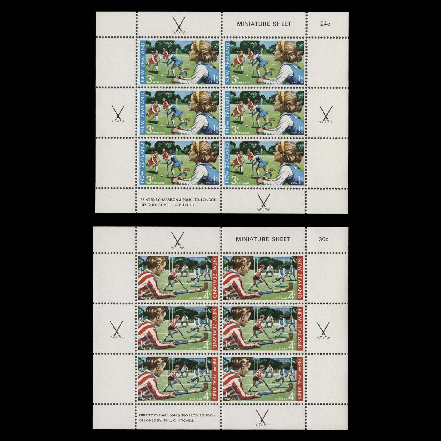 3c+1c and 4c+1c Children Playing Hockey health miniature sheets. Fresh and fine. Mint never hinged. SGMS963; CPTM43a/b