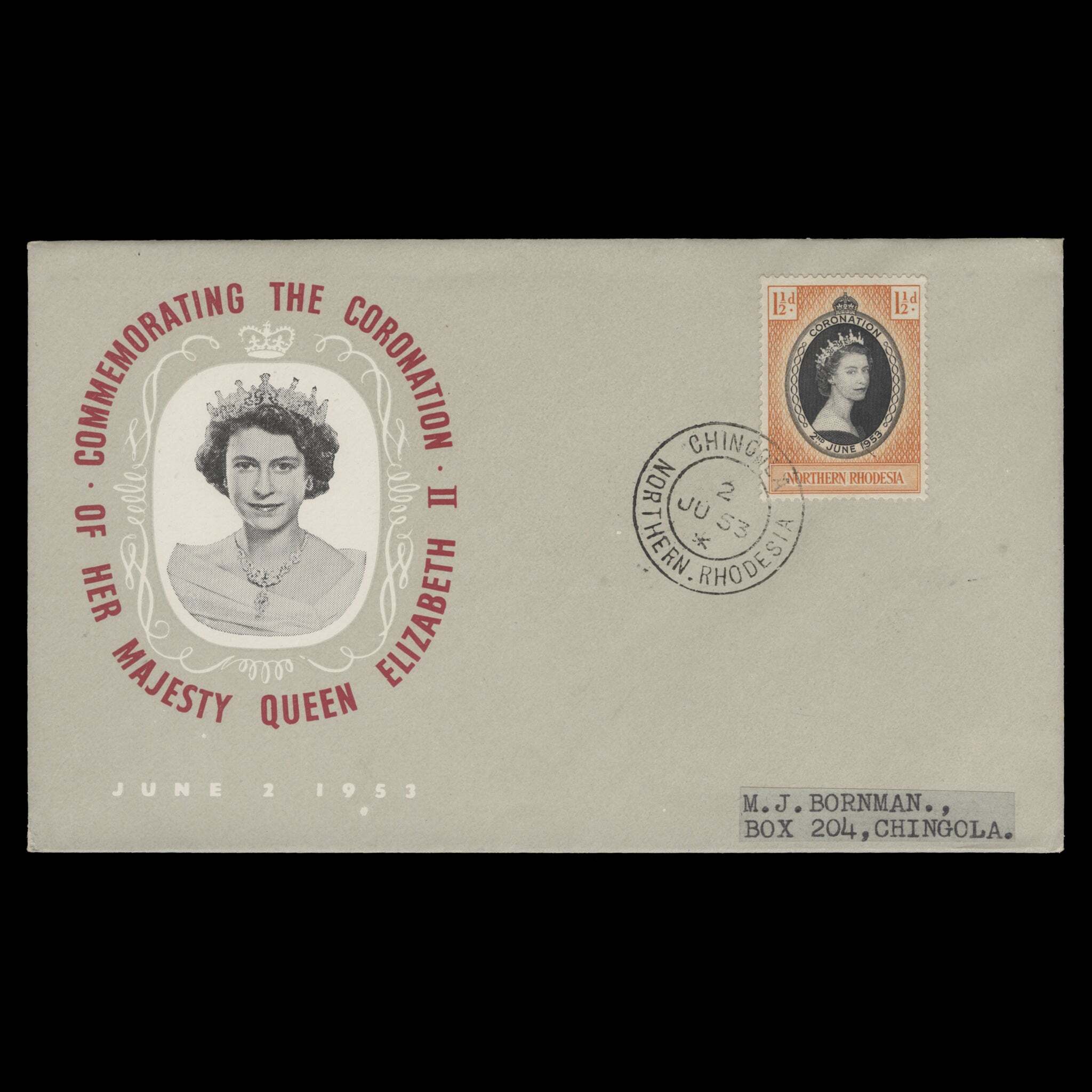 1½d Coronation single on type 1a John Lister locally-addressed cover with CHINGOLA, NORTHERN RHODESIA circular cancel dated 2 JU 53, the first day of issue. Generally fine. SG60; SC60Offers History