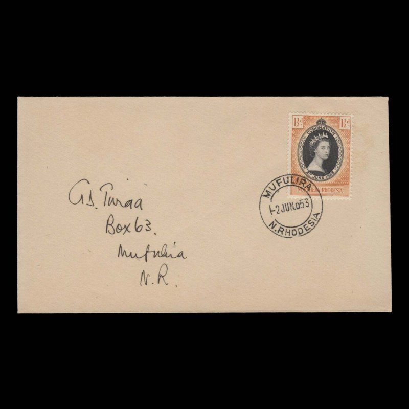 1½d Coronation single on plain, locally-addressed cover with MUFULIRA, N. RHODESIA circular cancel dated 2 JU 53, the first day of issue. Uncommon franking. Generally fine. SG60; SC60Offers History