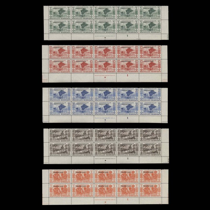 Various definitives, with 'TIMBRE-TAXE' overprint, imprint/plate 1 blocks x 10 (5 items). Very difficult assembly. Odd gum bend otherwise fresh and fine. Mint never hinged. SGFD92-D96; SCJ16-J20Offers History