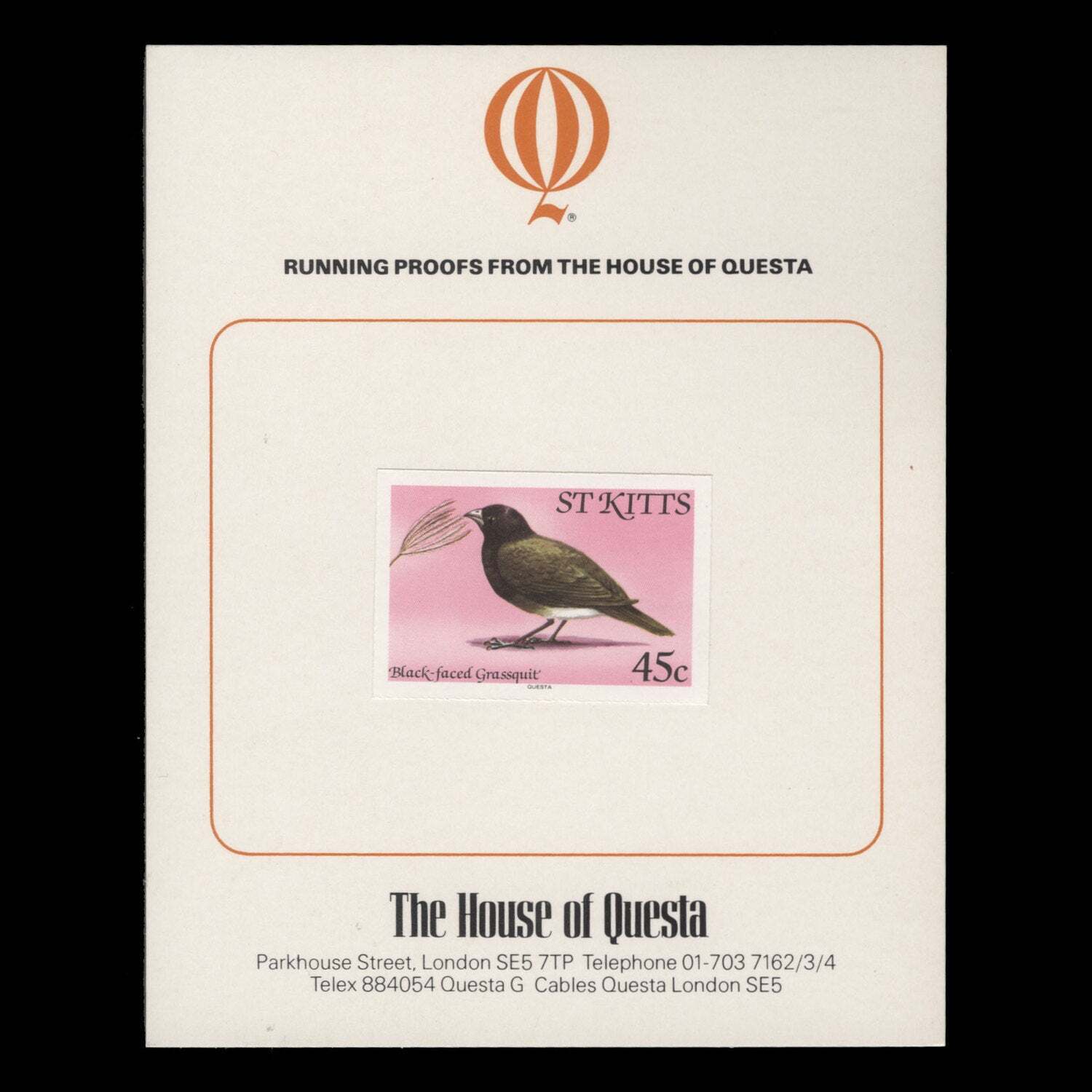 25c Grey Kingbird imperforate running proof single, with 'QUESTA' imprint, mounted on presentation card. Scarce. Fresh and fine. SG61Avar; SC57var
