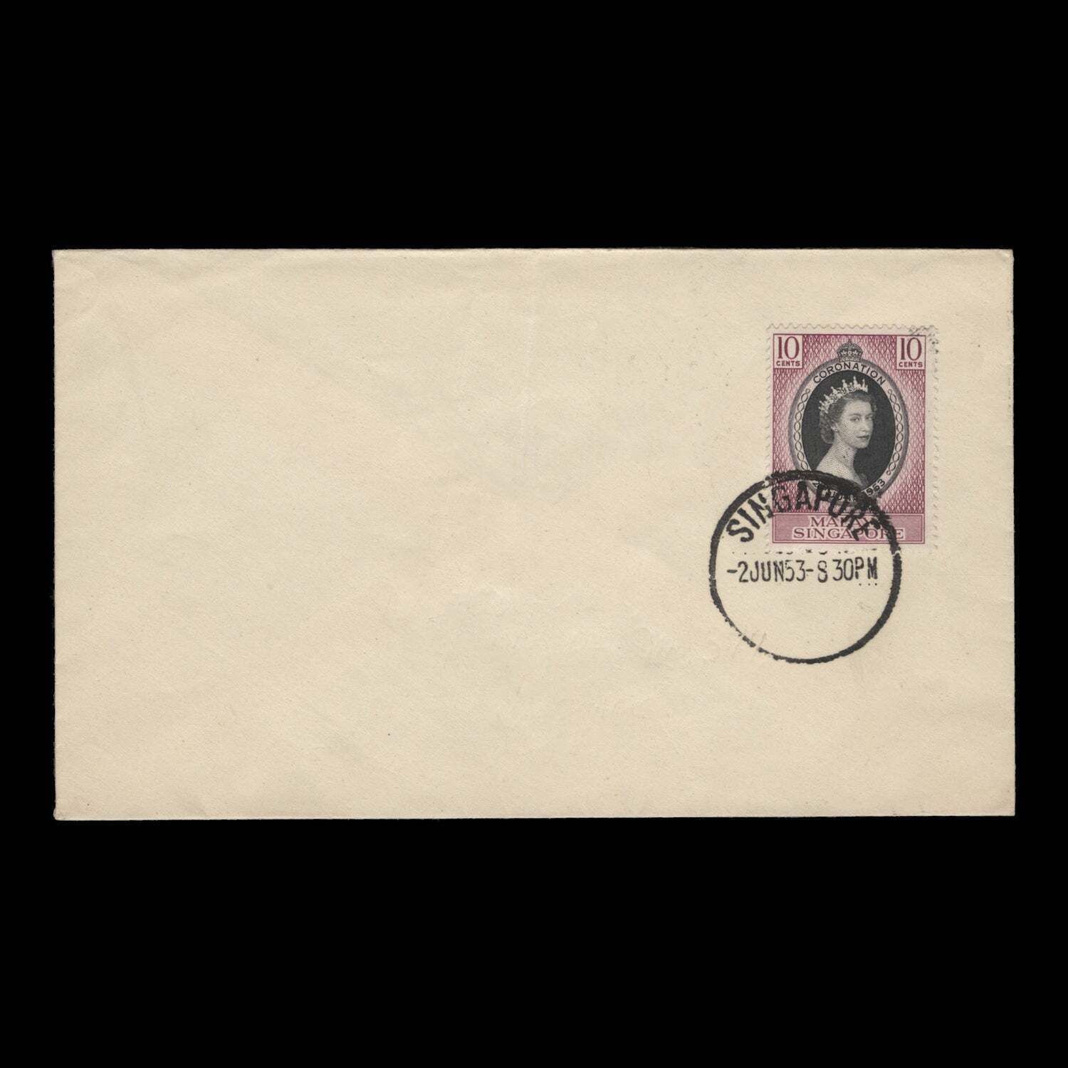 10c Coronation single on plain, unaddressed cover with SINGAPORE circular cancel dated 2 JUN 53, the first day of issue. Minor creasing otherwise fine. SG37; SC27Offers History