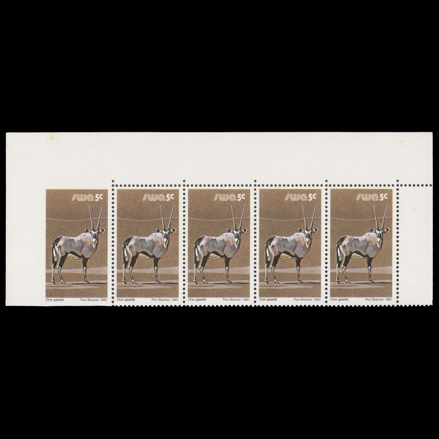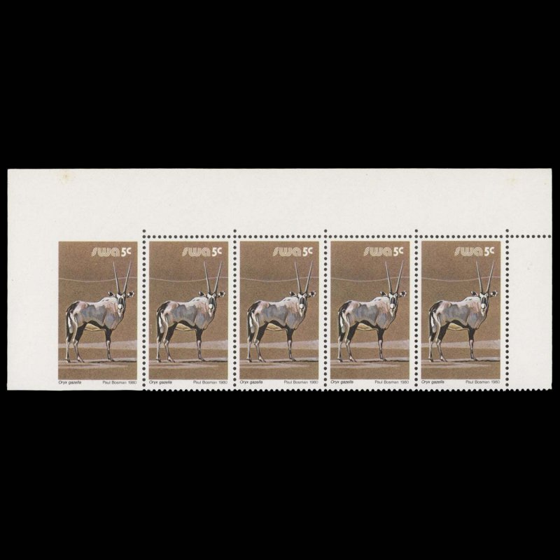 South West Africa 1980 (Variety) 5c Oryz Gazella strip, left stamp imperf ️