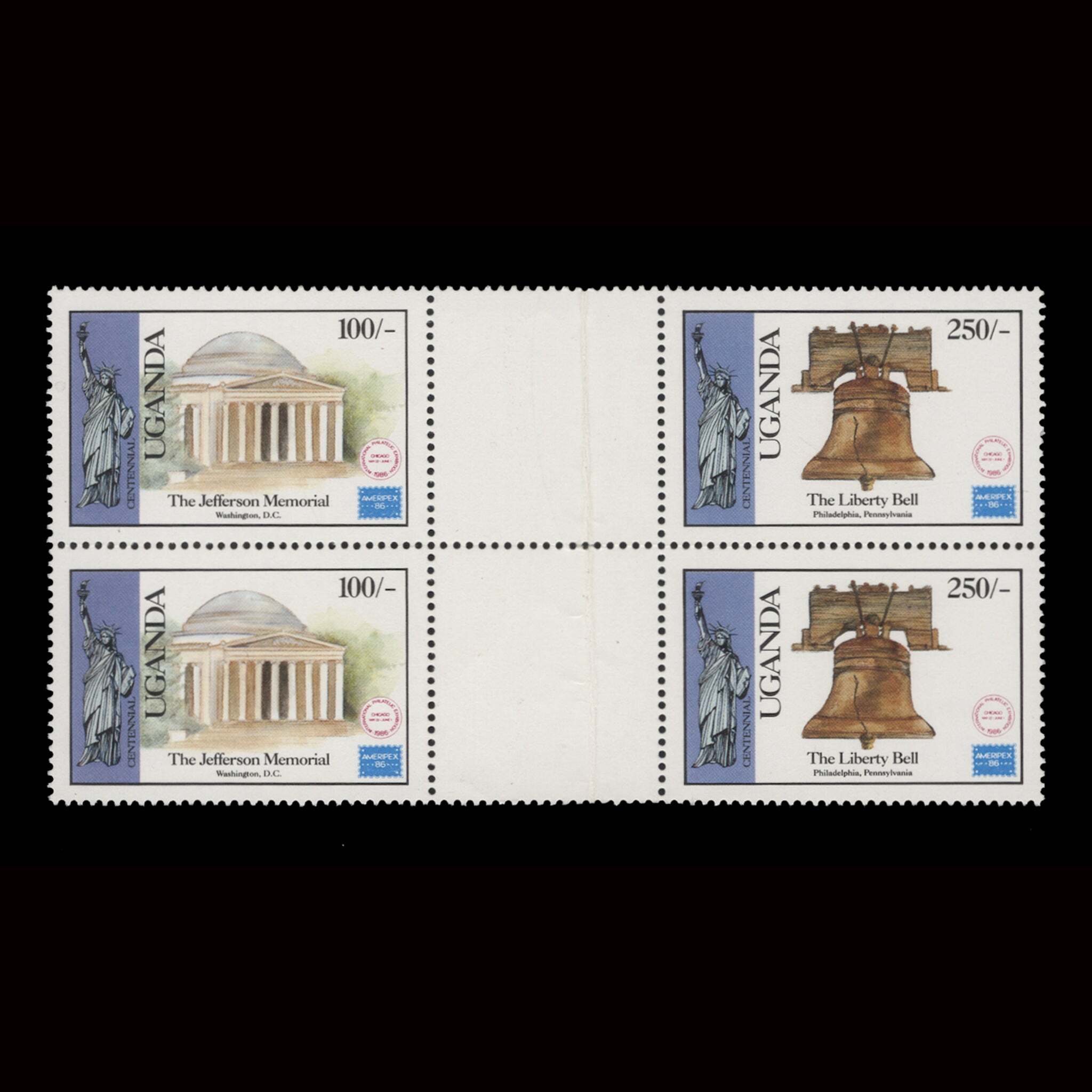 Uganda 1986 (MNH) International Stamp Exhibition, Chicago gutter block ️