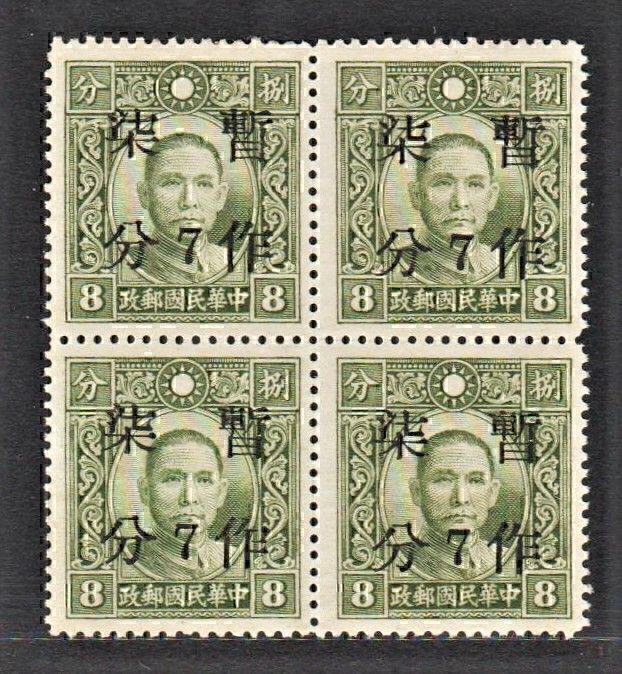 China 1941 江西 Kiangsi Surch. 7c on 8c DT Pt. SYS (1v Cpt, B/4) MNH