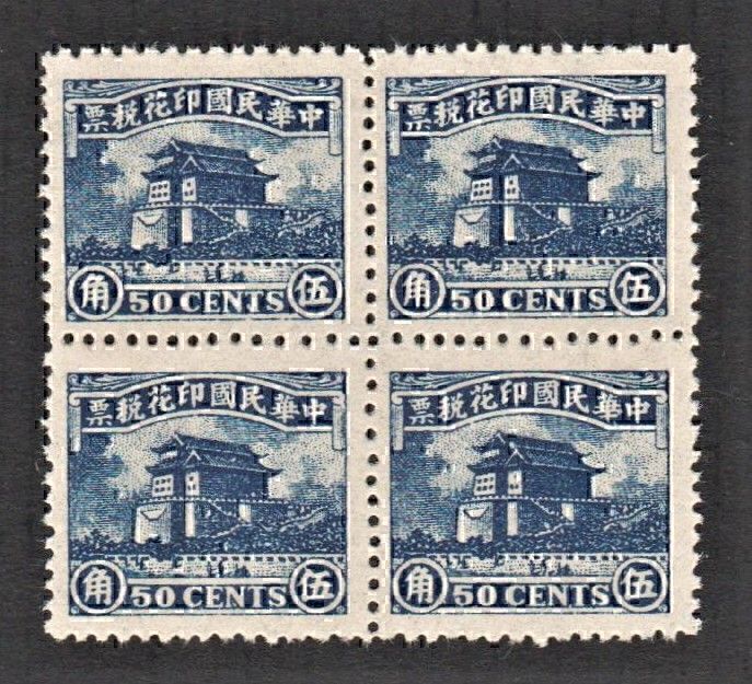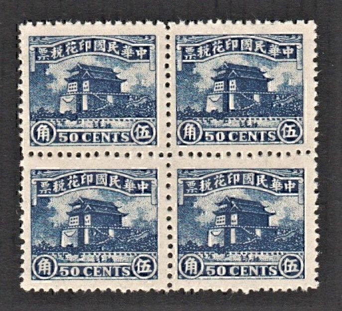 China 1944 Old Rev, Calm-sea Building 鎮海樓 (50c Blue, Block of 4) MNH